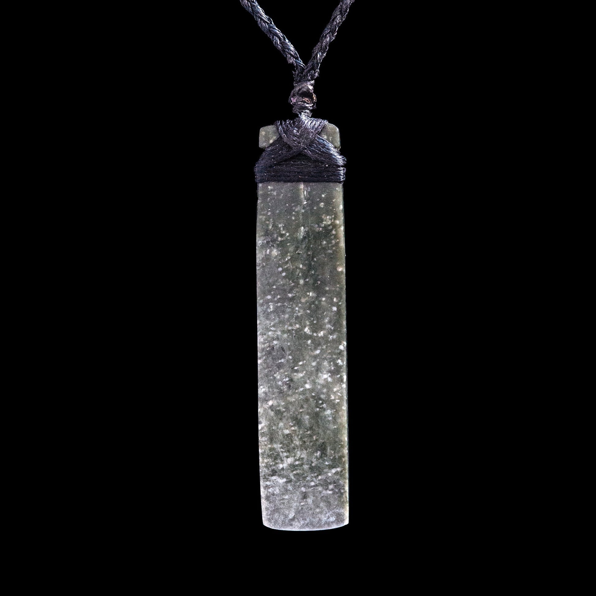 A bound Hei Toki pendant with binding, hand-carved in beautiful speckled New Zealand jade or pounamu by Ernesto Ovalle. Ernesto was entranced by this stone, which is quite unusual, which is why he made a series of these.