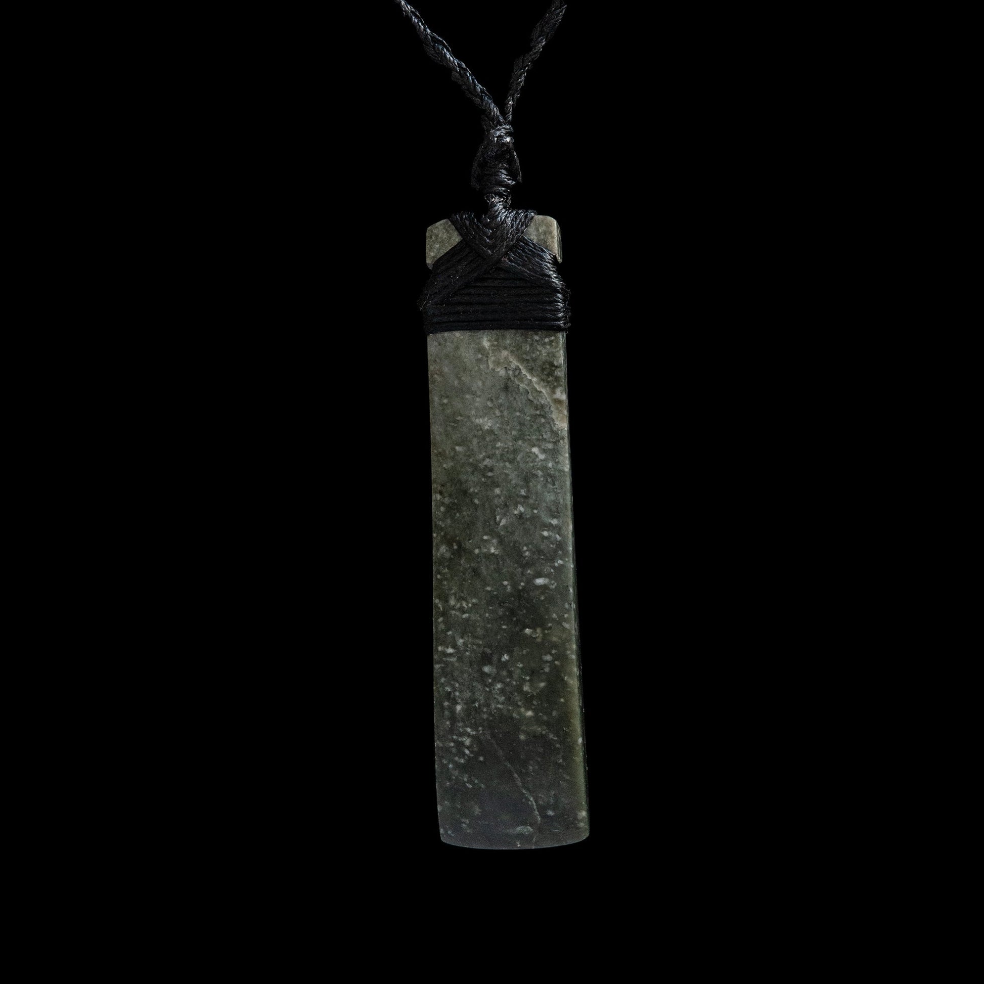 A bound Hei Toki pendant with binding, hand-carved in beautiful speckled New Zealand jade or pounamu by Ernesto Ovalle. Ernesto was entranced by this stone, which is particularly unusual, and is why he made a series of these.