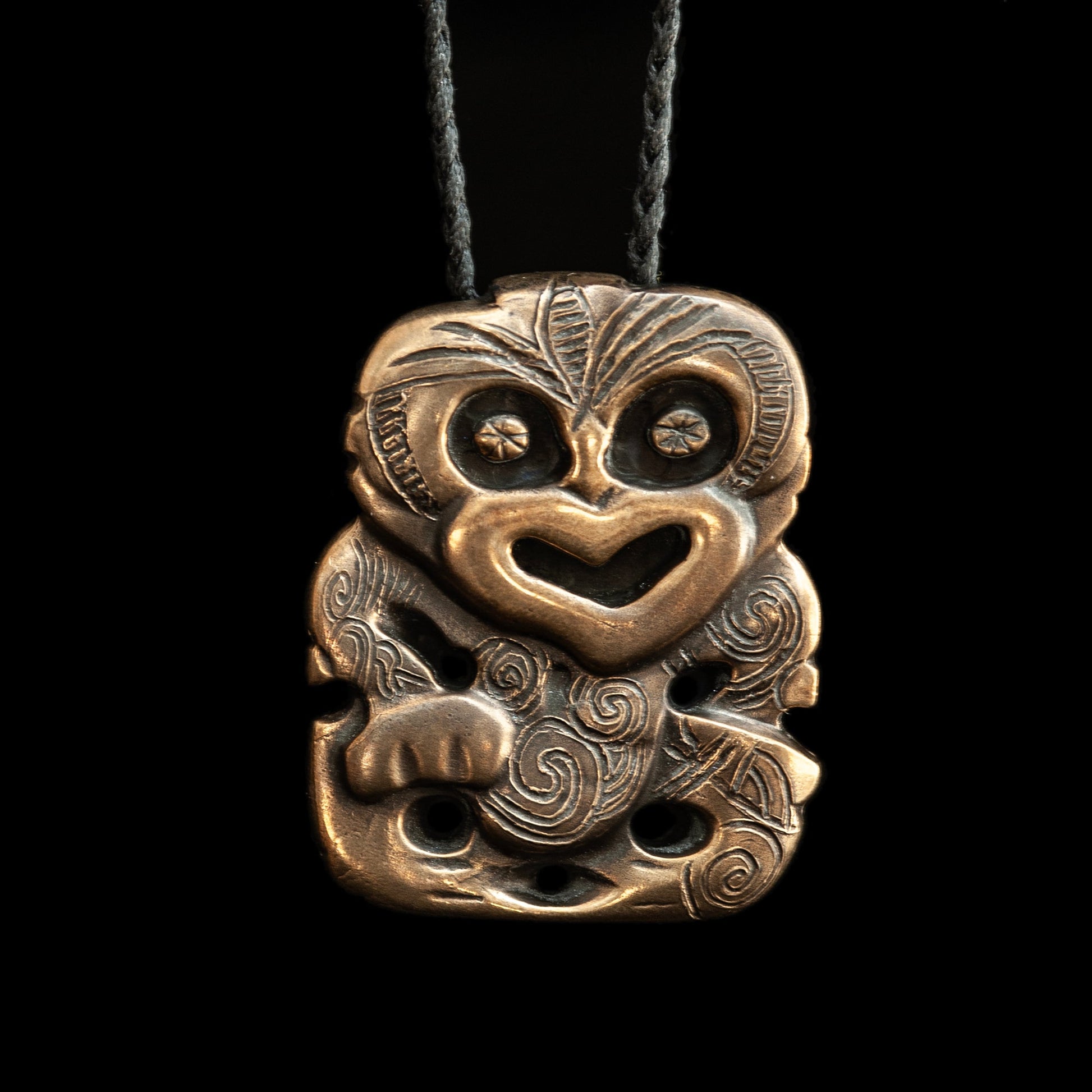 An exquisite brass Tiki hand-crafted pendant by Nick and Mady.