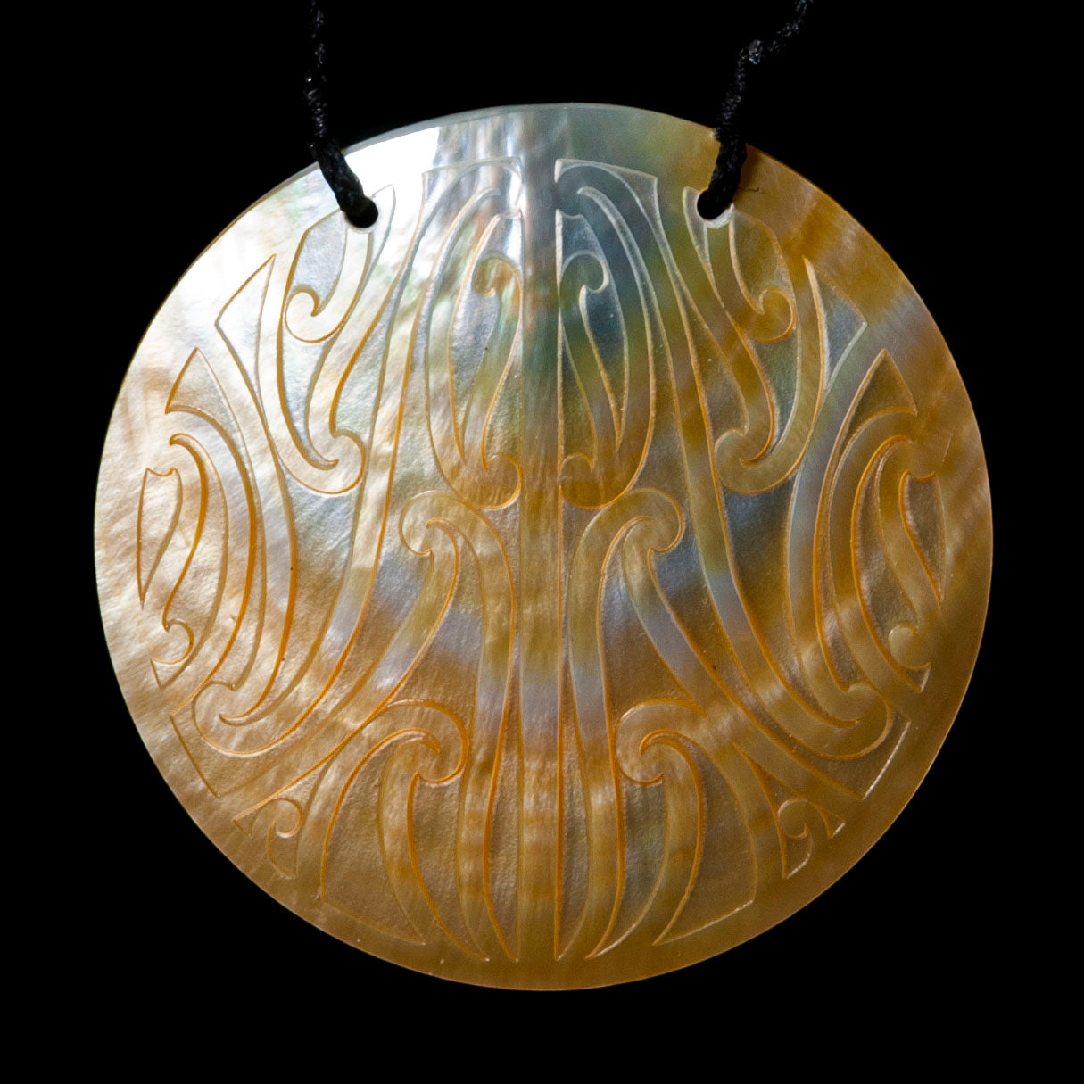 A engraved mother of pearl disc, with detailed koru work and shapes inspired by the Ponga tree or Silver Fern.