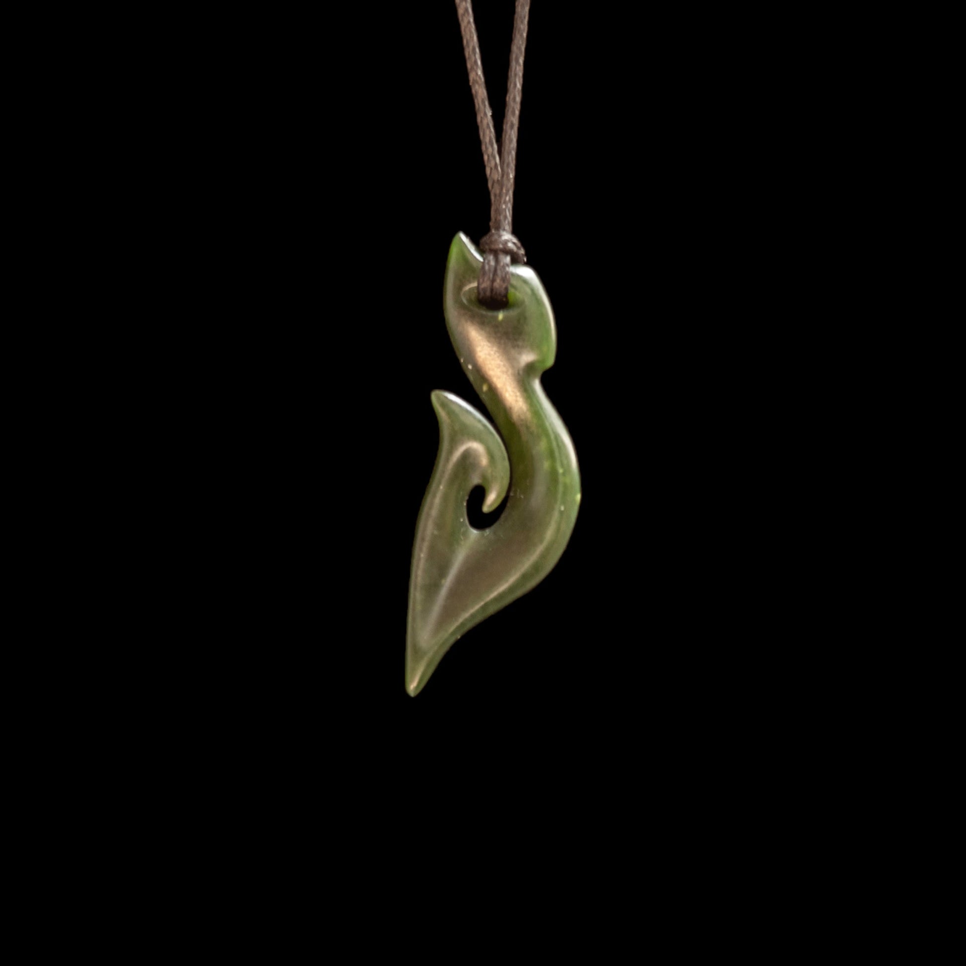 A satin finished New Zealand jade or pounamu Matau pendant by Shaun Gardiner.