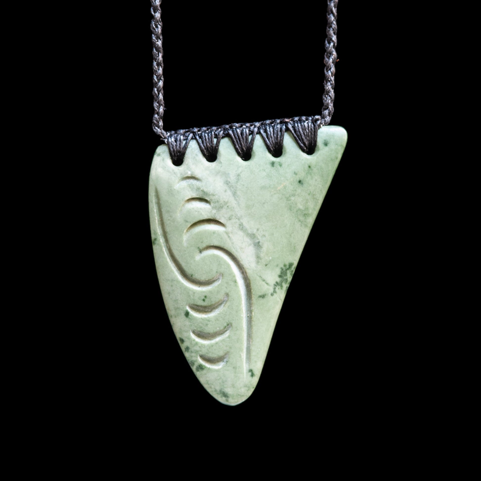 A handcrafted New Zealand contemporary Jade niho (whale tooth) drop pendant. Carved by Alex Sands.