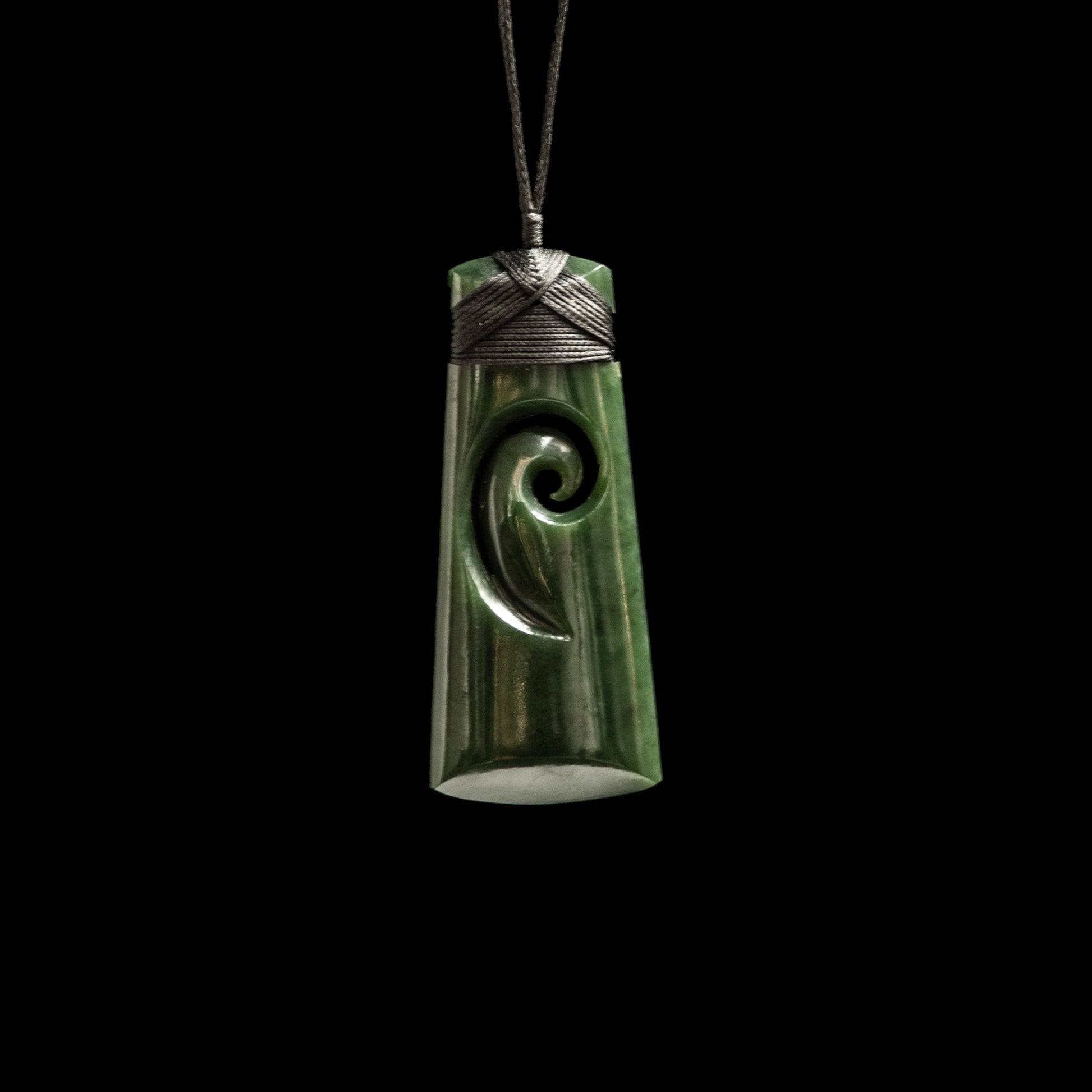 A hand-crafted New Zealand jade toki style pendant with a koru carved into the surface.