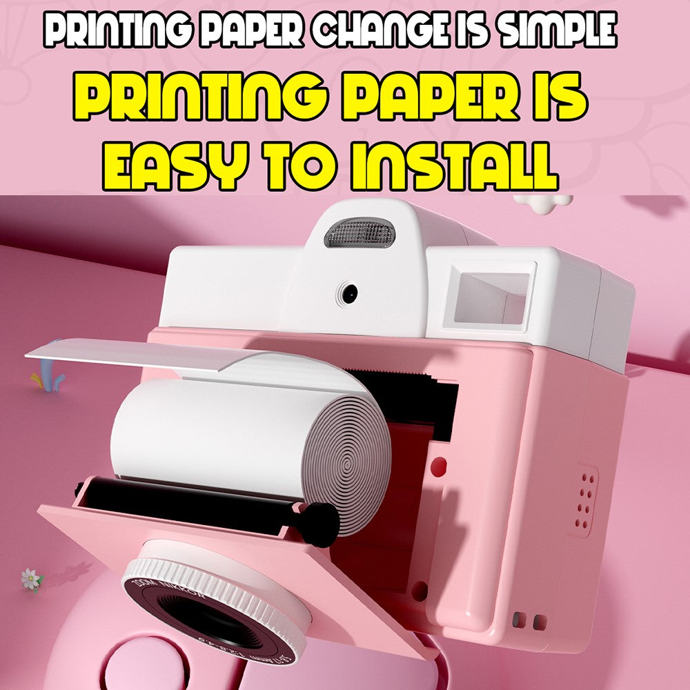 - This children's digital camera features a thermal printing mechanism that allows kids to print their photos instantly in black and white at 200 dpi resolution