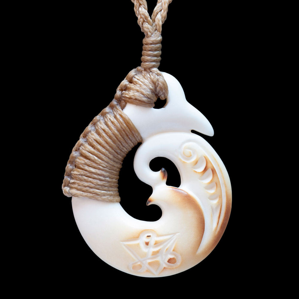 A hand carved bone Koru necklace designed for and worn by Andrew Savage of the TV series Survivor.