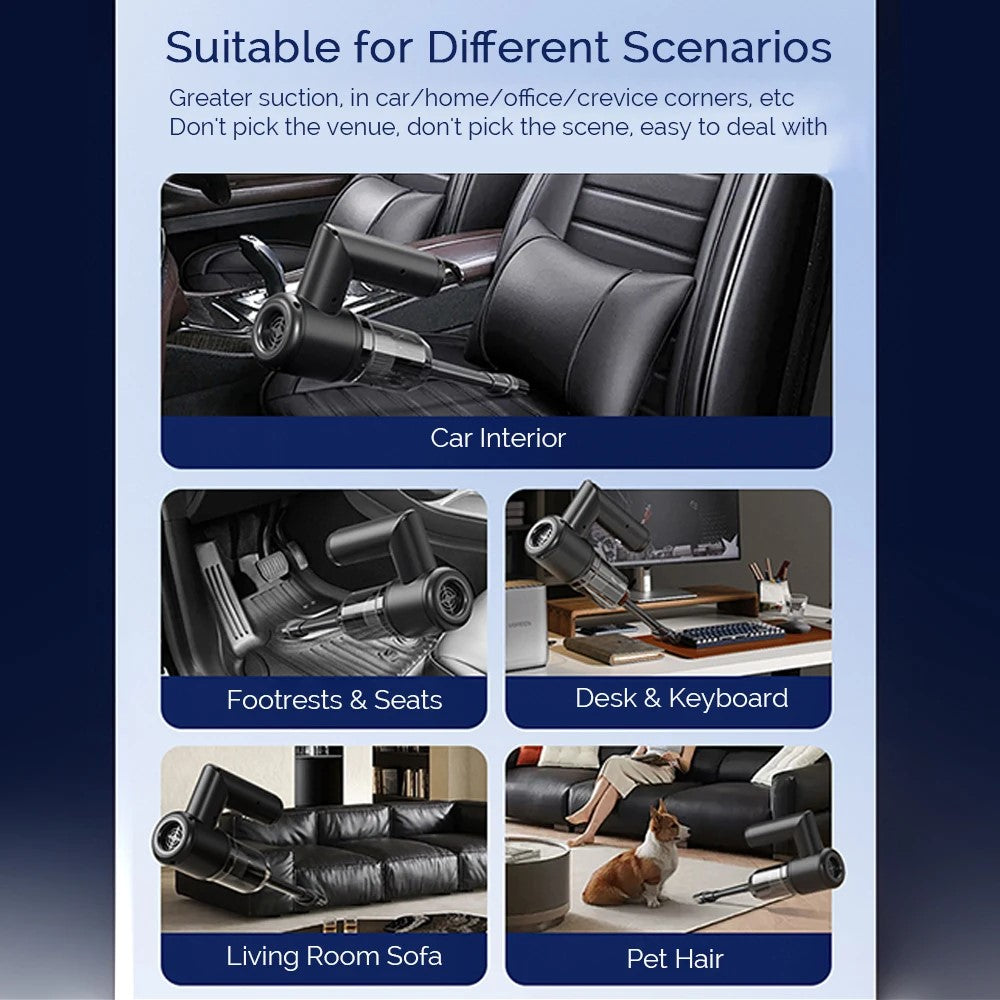 • 【5-in-1 Multifunctional Design】This versatile device combines suction, blowing, extraction, scraping, and glass cleaning functionalities, perfect for both car and home use.