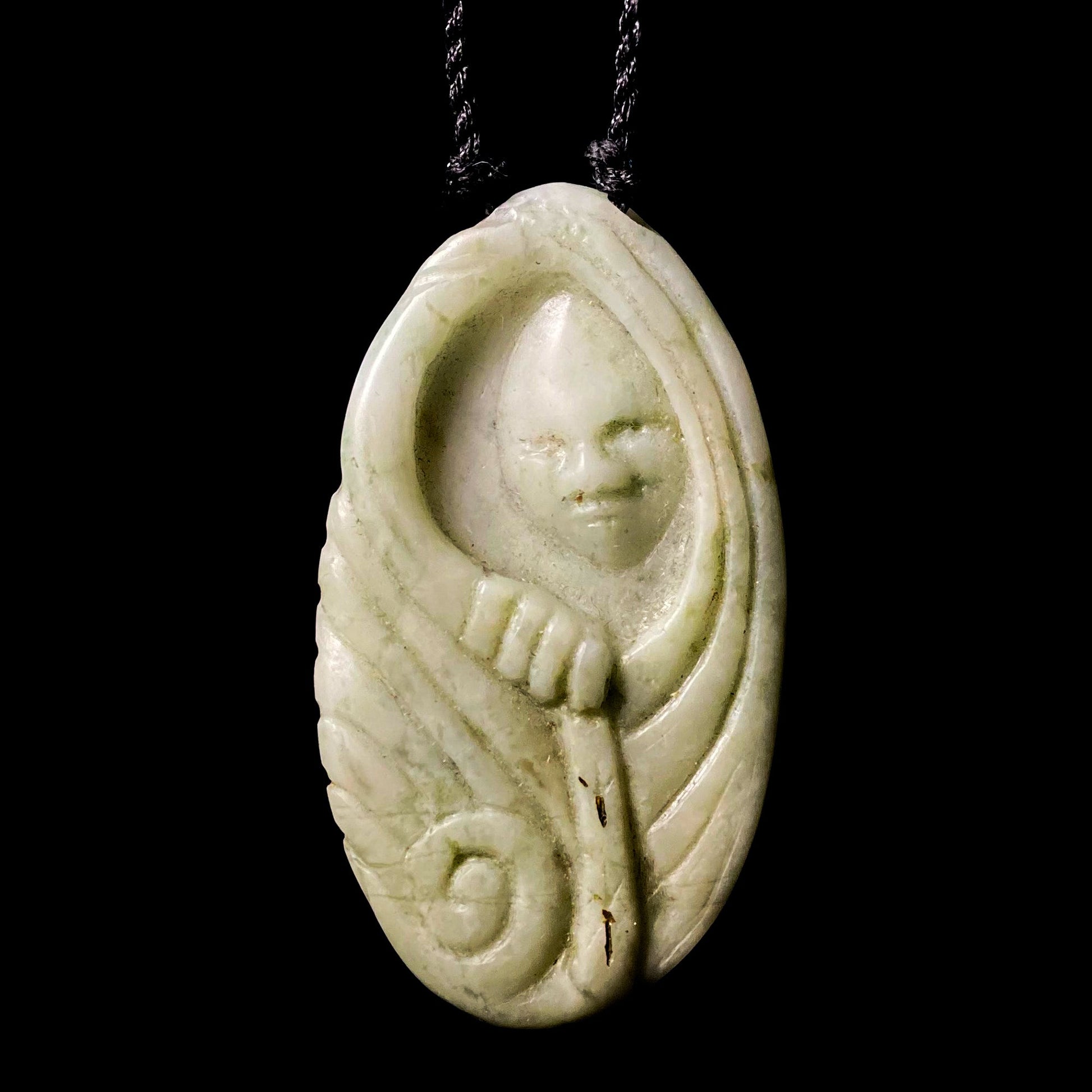 A hand crafted Wheku (head) form pendant carved in Aotea jade. Here are some words from the artist about the type of stone, its meaning and symbolism within the Māori world; "A small figure is revealed from within a shroud.The Runes of Life and Death are etched on below. The back is patterned as fingertips might be. I often think of what the world was like for our ancestors. Stories told to me of how people of old were prepared to battle. I reflect on the courage it took them or perhaps the love that drove them to defend their people, their environment, their values. I remembered the greif of loosing loved ones and how that might compel someone to battle, the pain of gall stones or an ailment that left one “less than”, The longing for death with honour The thought is so foreign to us in the context of our time, we seek the longest life and place importance on “things”. Ora Mate imagines an ancestor who reminds us that we existed at the point of conception. When no other but God identified us. And we were that God and that God was us. Perhaps life is a process of working back towards that point."