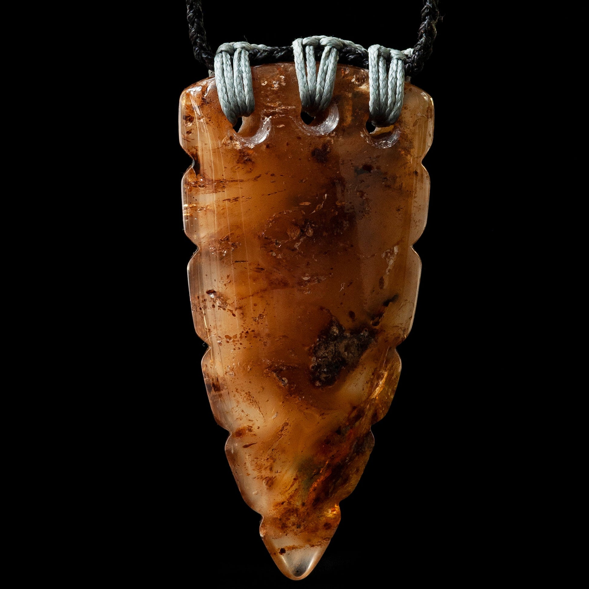 A stunning Rei Niho pendant hand carved in translucent New Zealand fossil Kauri gum or amber by Conrad Henderson.